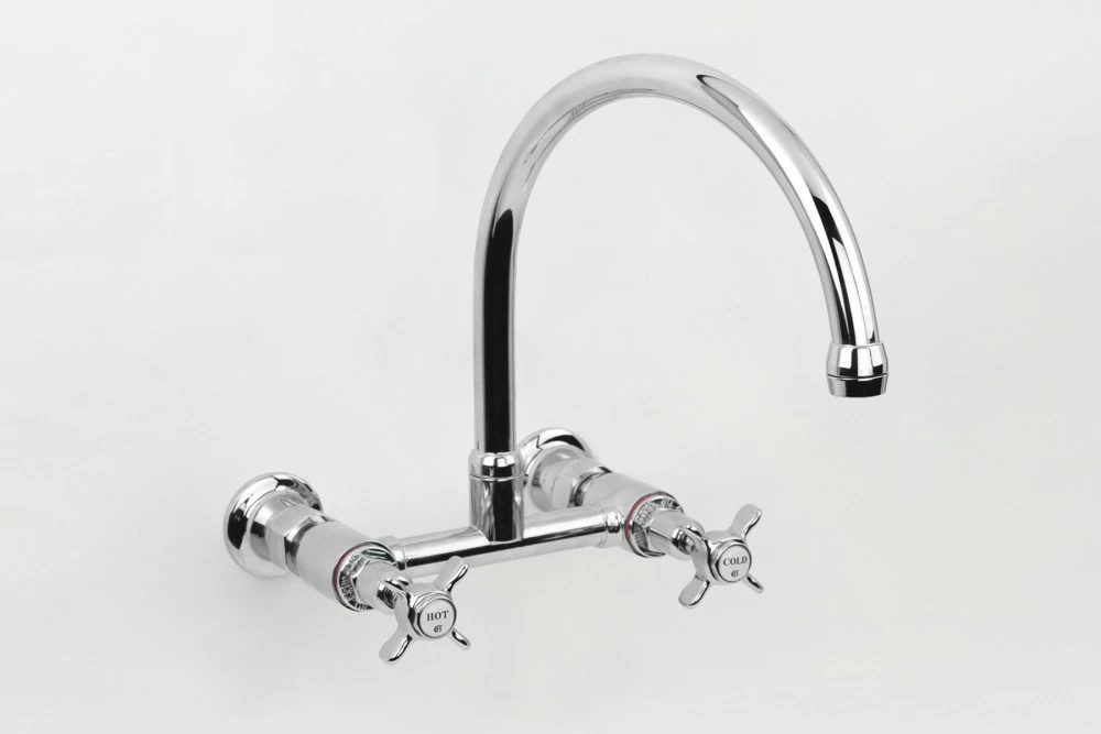 Heritage Exposed Wall Sink Set with Straight Breech & Gooseneck Outlet includes tap assemblies, exposed breech and outlet.