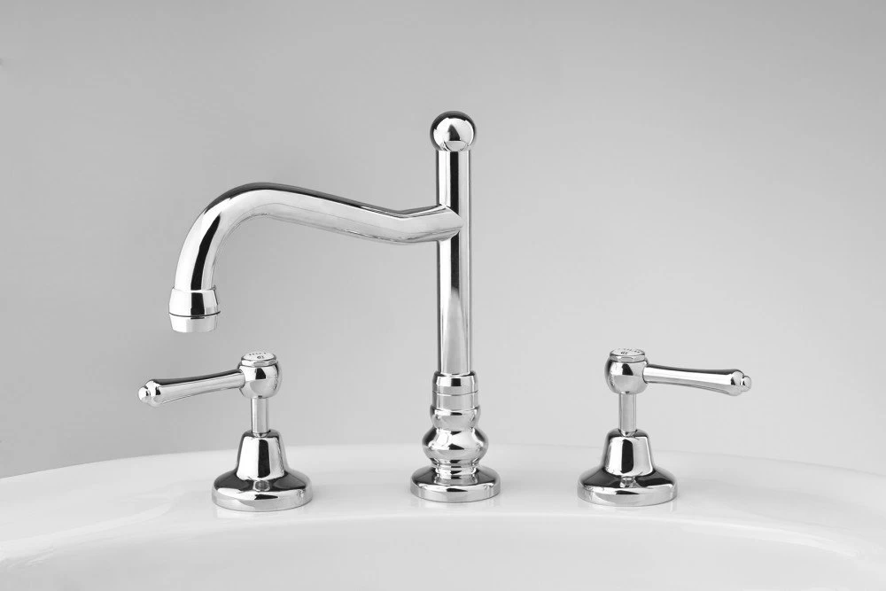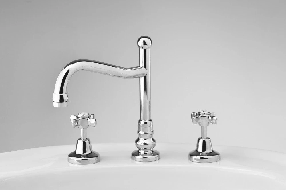 Olde Adelaide Basin Set with Swivel Outlet and Roulette Handles. Includes the outlet, standard under assembly and two basin tap top assemblies.