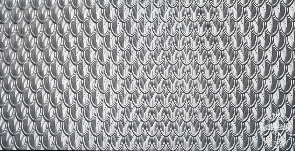 The Fish Scale design is a classic pattern that was extremely popular in the early 1900’s for use outdoors, especially on awnings. Today the Fish Scale design is used for both reproduction of these original creations as well as a modern additions to houses and commercial projects. The Fish Scale design is from the original Pressed Tin Panels® set and the naming was quite self explanatory. It’s suitable for a wide range of wall or ceiling installations and can be painted or powder coated in a myriad of colours. Suggested usage includes: outdoors, awnings, feature walls, kitchen splash backs, bathroom tile alternatives, counter fronts and many more.