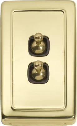 Flat plate 2 gang toggle switches with brass covers and HPM mechanisms. Matching sockets and compatible accessories also available.