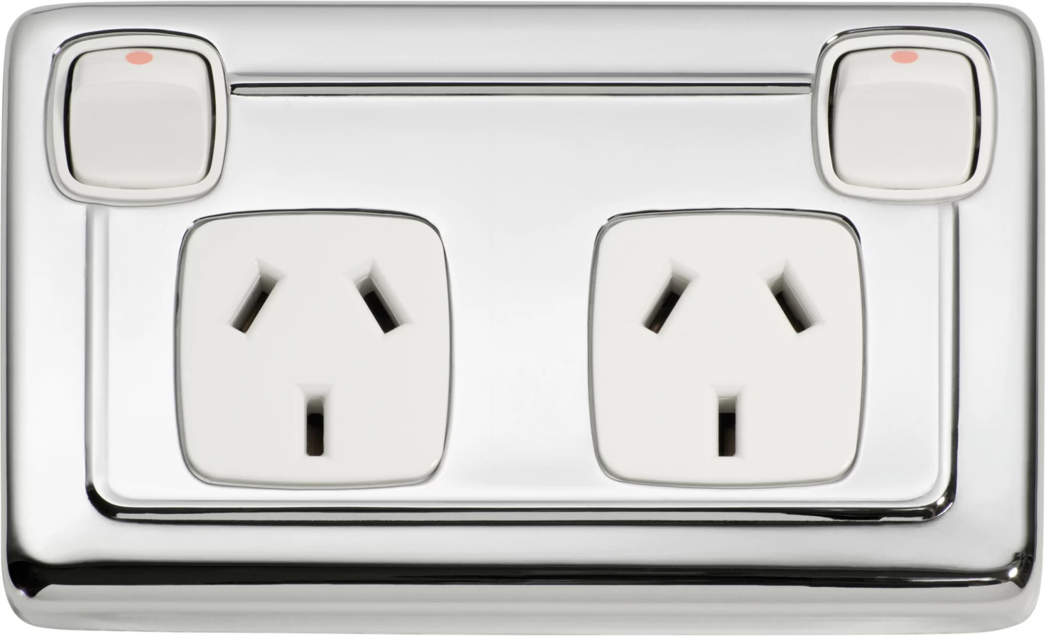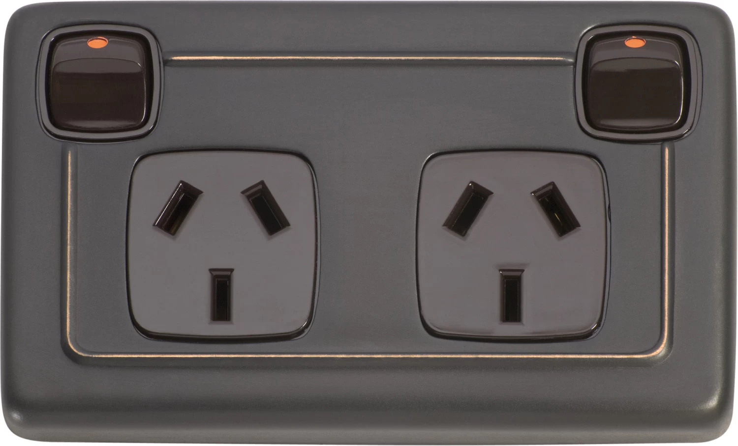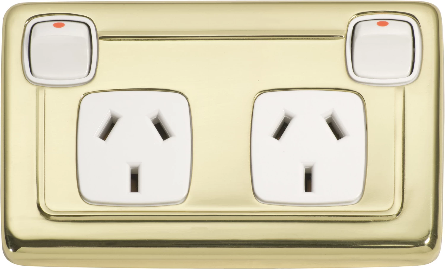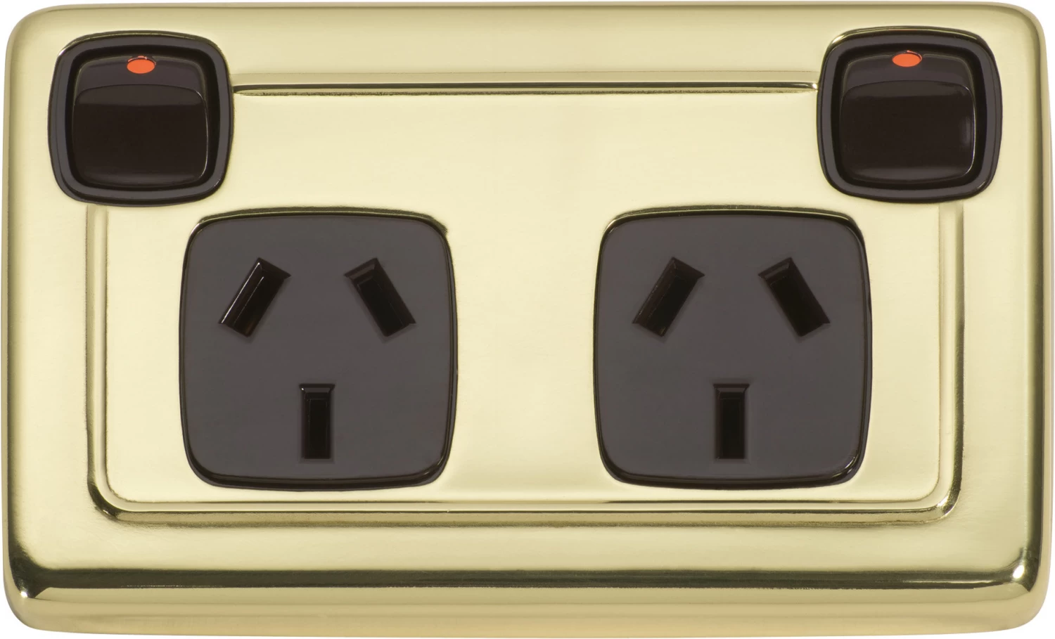 Flat plate sockets with rocker switches and brass covers. Available in single or double socket with 1, 2 or 3 switches with white, brown or black HPM mechanisms.