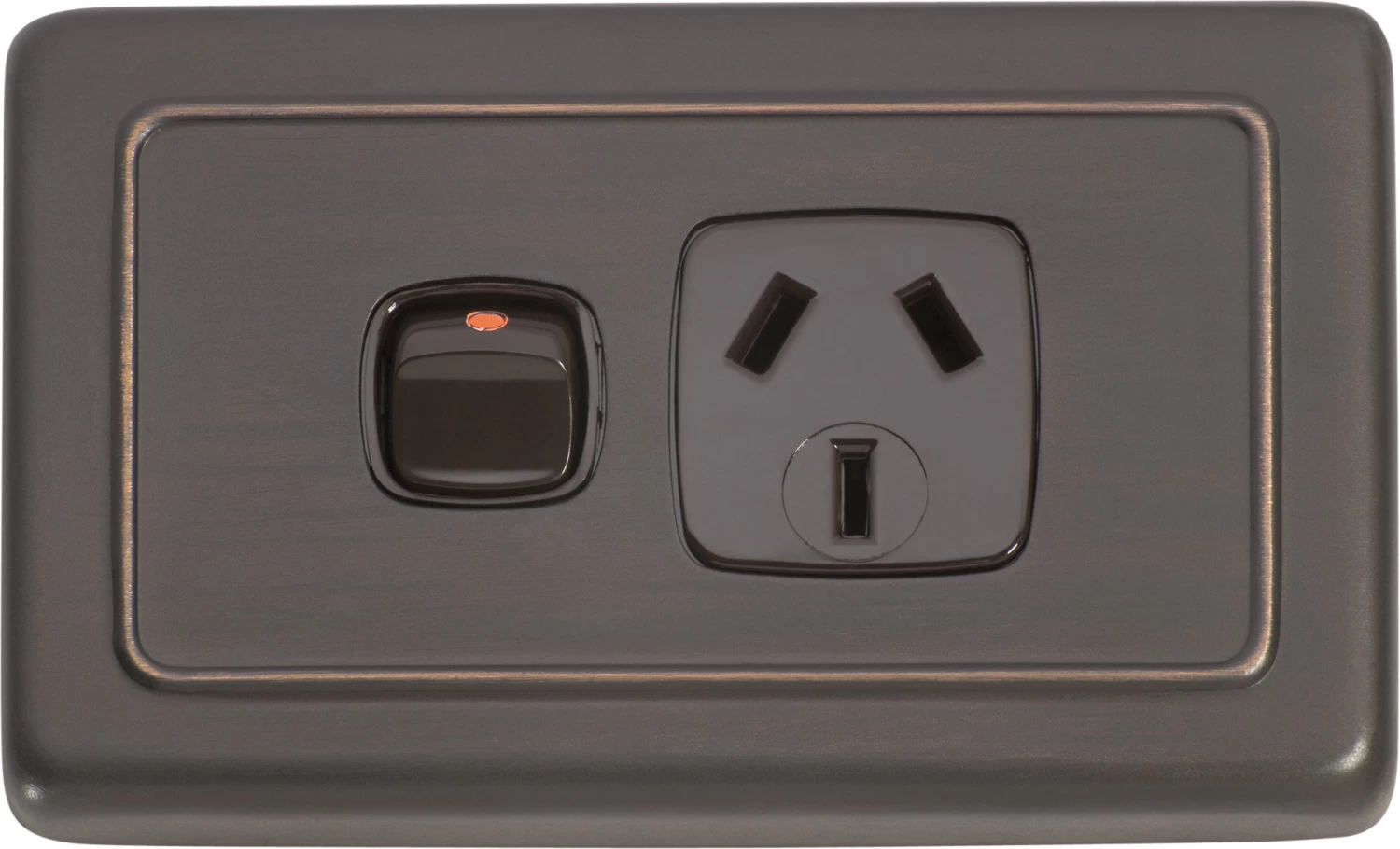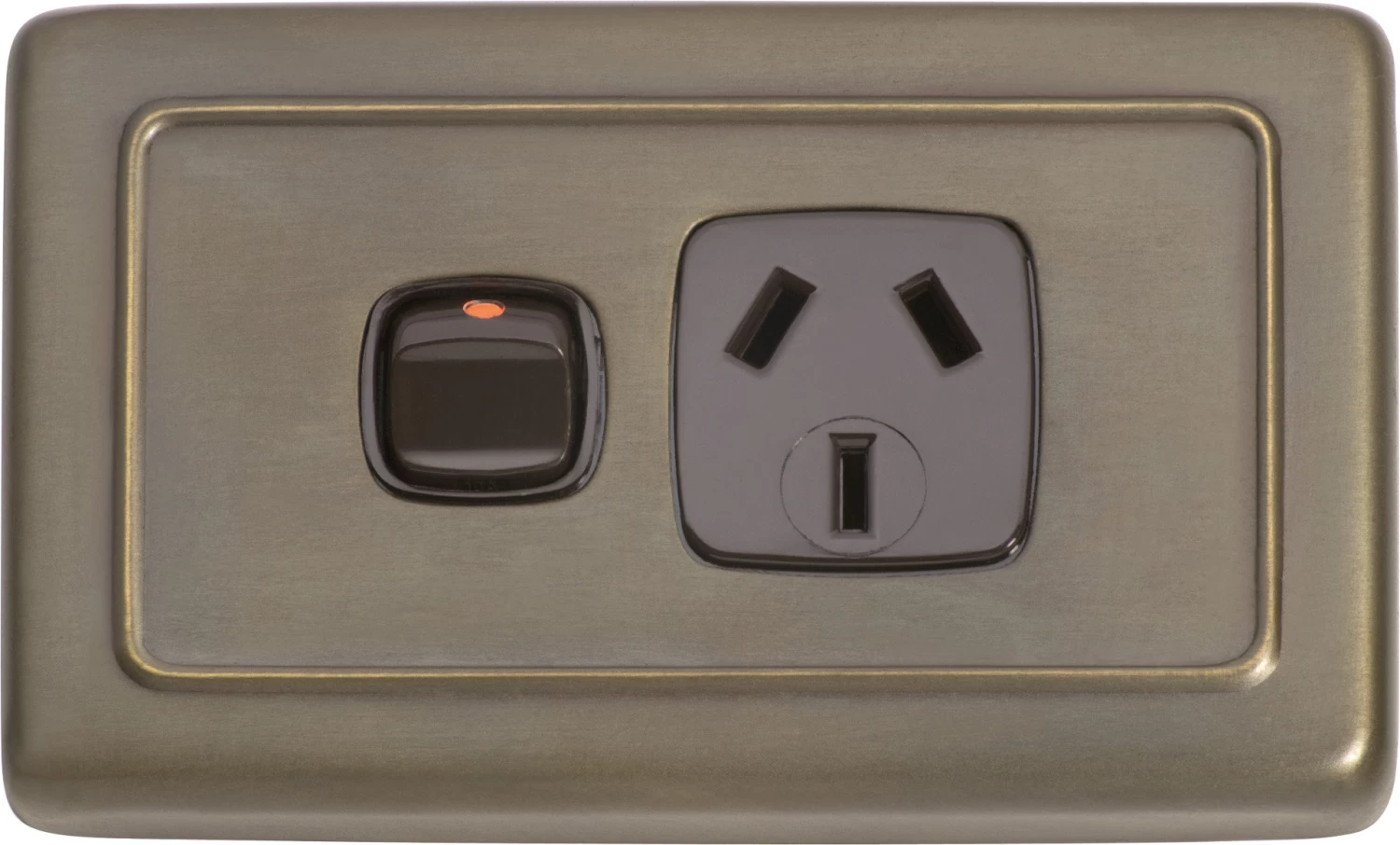 Flat plate sockets with rocker switches and brass covers. Available in single or double socket with 1, 2 or 3 switches with white, brown or black HPM mechanisms.